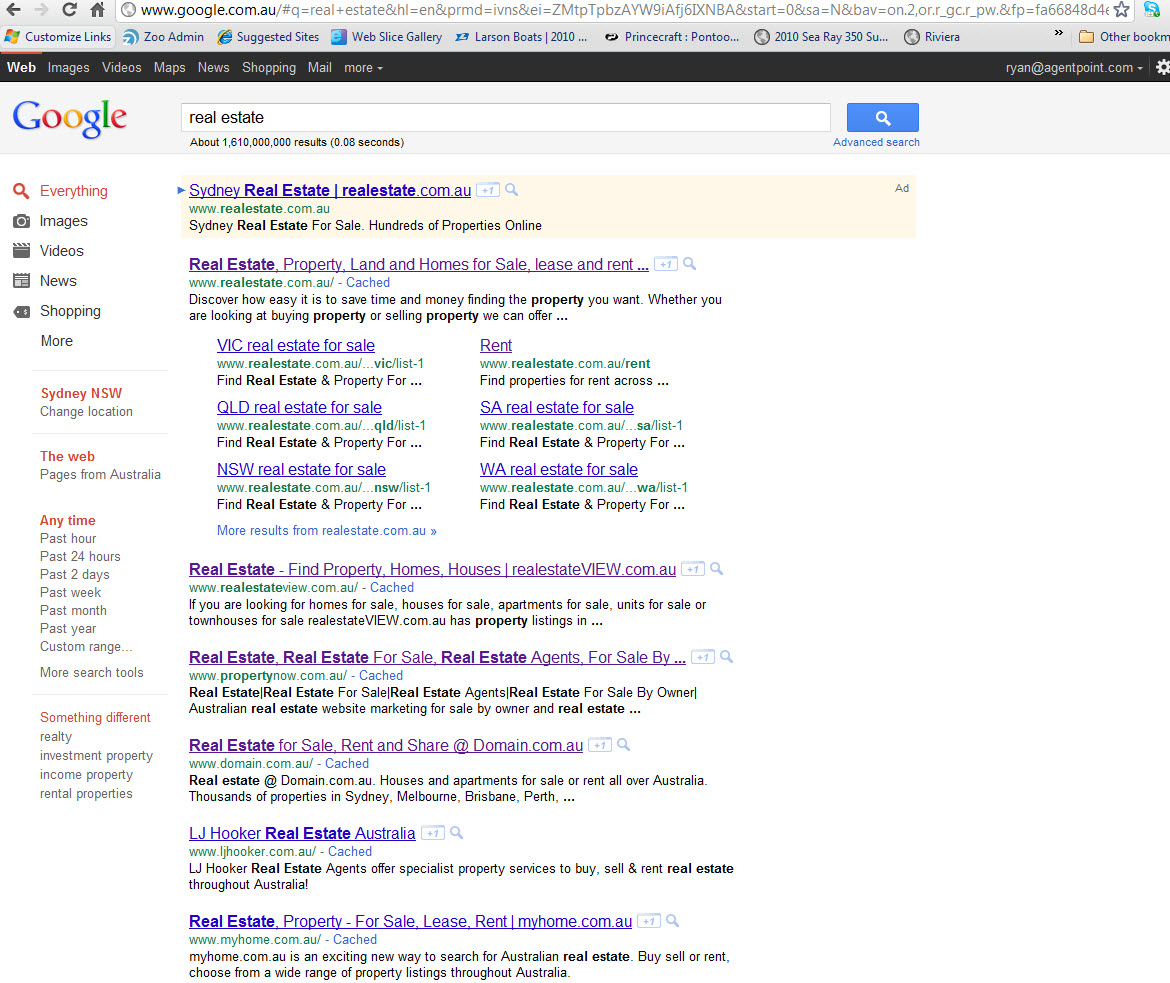 Over the last week it appears Realestateview has launched itself up the Google search results for the term “real estate” now ranking number 2 behind Realestate.com.au. Domain which was number 2 has now been pushed down to the 4th result below PropertyNow.com.au